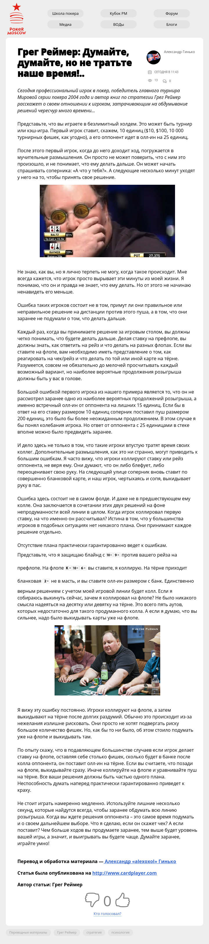 Сегодня профессиональный игрок в покер, победитель главного турнира Мировой серии покера 2004 года и автор книг по стратегии Грег Реймер расскажет о своем отношении к игрокам, затрачивающим на обдумывание решений чересчур много времени…