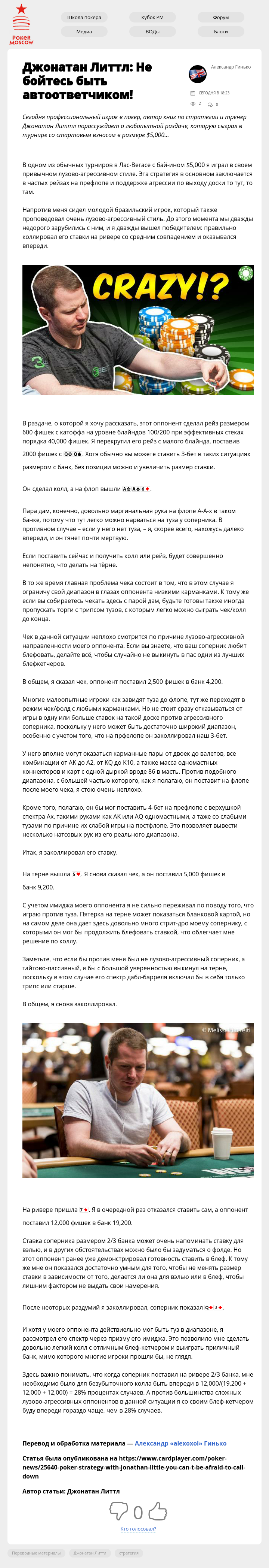Сегодня профессиональный игрок в покер, автор книг по стратегии и тренер Джонатан Литтл порассуждает о любопытной раздаче, которую сыграл в турнире со стартовым взносом в размере $5,000…