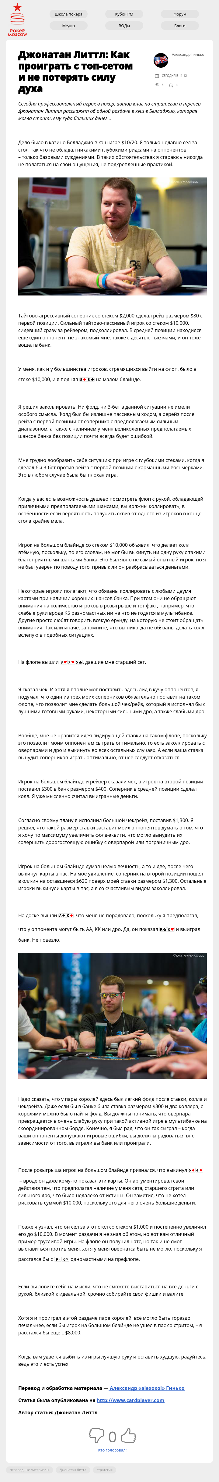 Сегодня профессиональный игрок в покер, автор книг по стратегии и тренер Джонатан Литтл расскажет об одной раздаче в кэш в Белладжио, которая могла стоить ему куда больших денег…