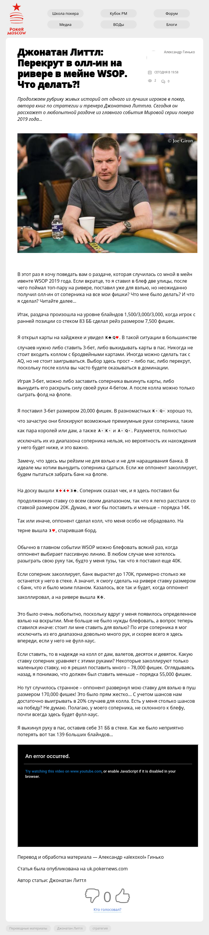 Продолжаем рубрику живых историй от одного из лучших игроков в покер, автора книг по стратегии и тренера Джонатана Литтла. Сегодня он расскажет о любопытной раздаче из главного события Мировой серии покера 2019 года…