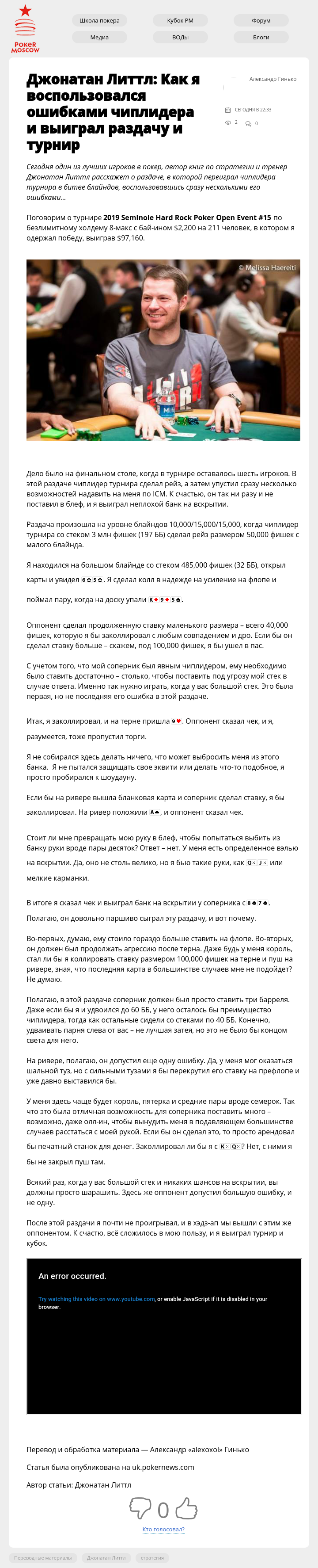 Сегодня один из лучших игроков в покер, автор книг по стратегии и тренер Джонатан Литтл расскажет о раздаче, в которой переиграл чиплидера турнира в битве блайндов, воспользовавшись сразу несколькими его ошибками…