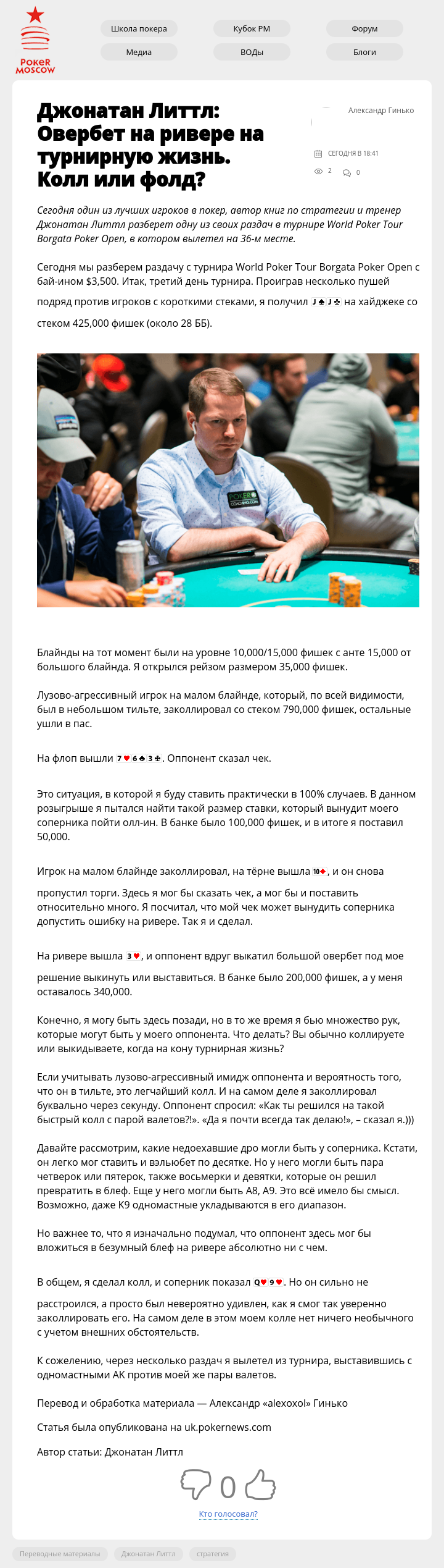 Сегодня один из лучших игроков в покер, автор книг по стратегии и тренер Джонатан Литтл разберет одну из своих раздач в турнире World Poker Tour Borgata Poker Open, в котором вылетел на 36-м месте.