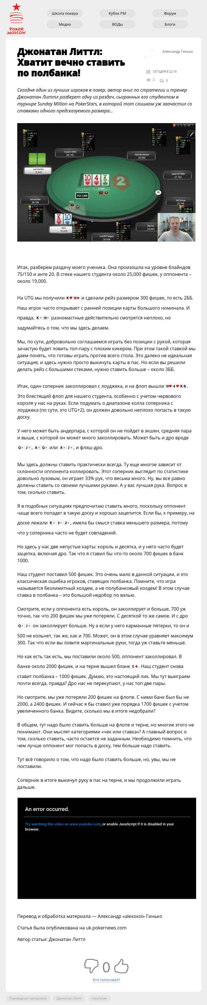 Сегодня один из лучших игроков в покер, автор книг по стратегии и тренер Джонатан Литтл разберет одну из раздач, сыгранных его студентом в турнире Sunday Million на PokerStars, в которой тот слишком уж заачастил со ставками одного предсказуемого размера…