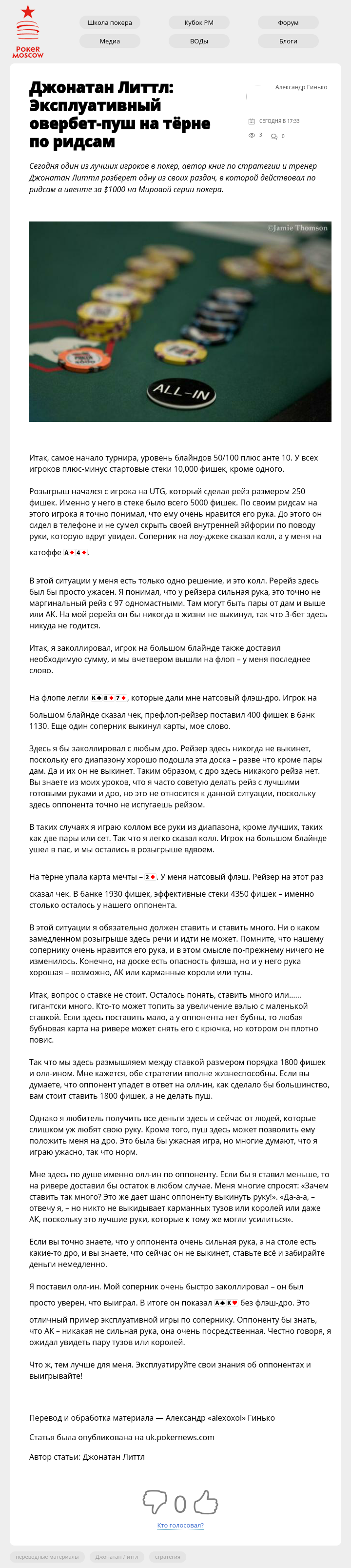 Сегодня один из лучших игроков в покер, автор книг по стратегии и тренер Джонатан Литтл разберет одну из своих раздач, в которой действовал по ридсам в ивенте за $1000 на Мировой серии покера.