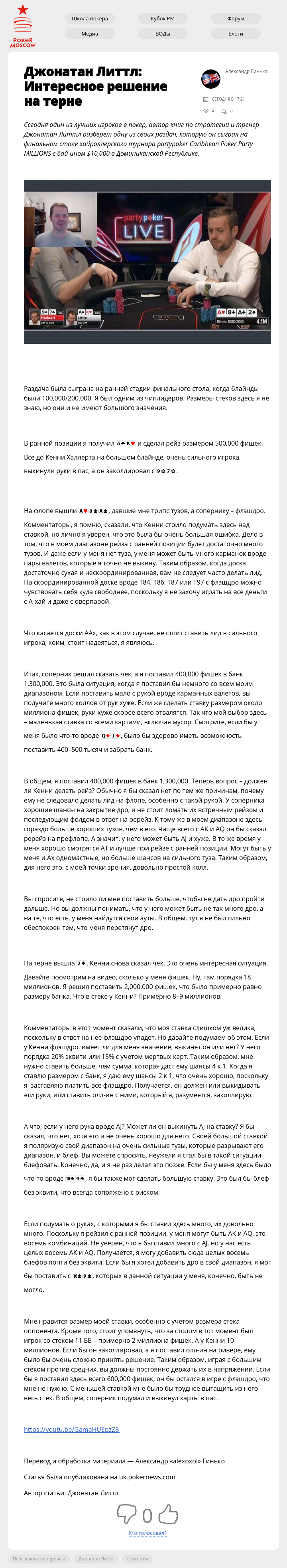 Сегодня один из лучших игроков в покер, автор книг по стратегии и тренер Джонатан Литтл разберет одну из своих раздач, которую он сыграл на финальном столе хайроллерского турнира partypoker Caribbean Poker Party MILLIONS с бай-ином $10,000 в Доминиканской Республике.